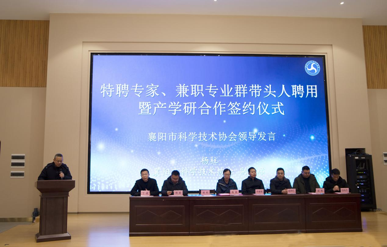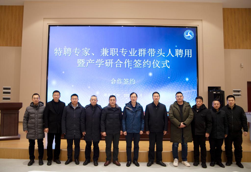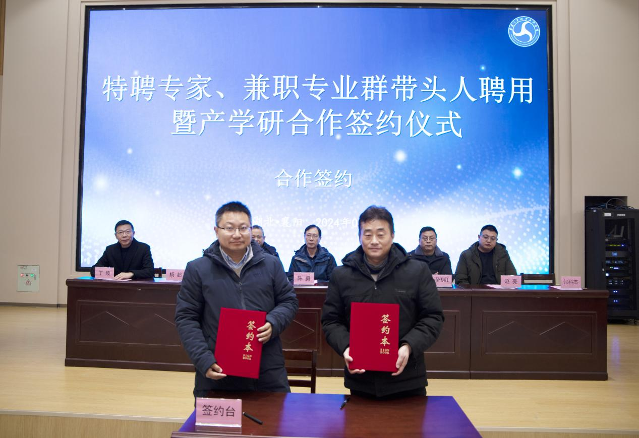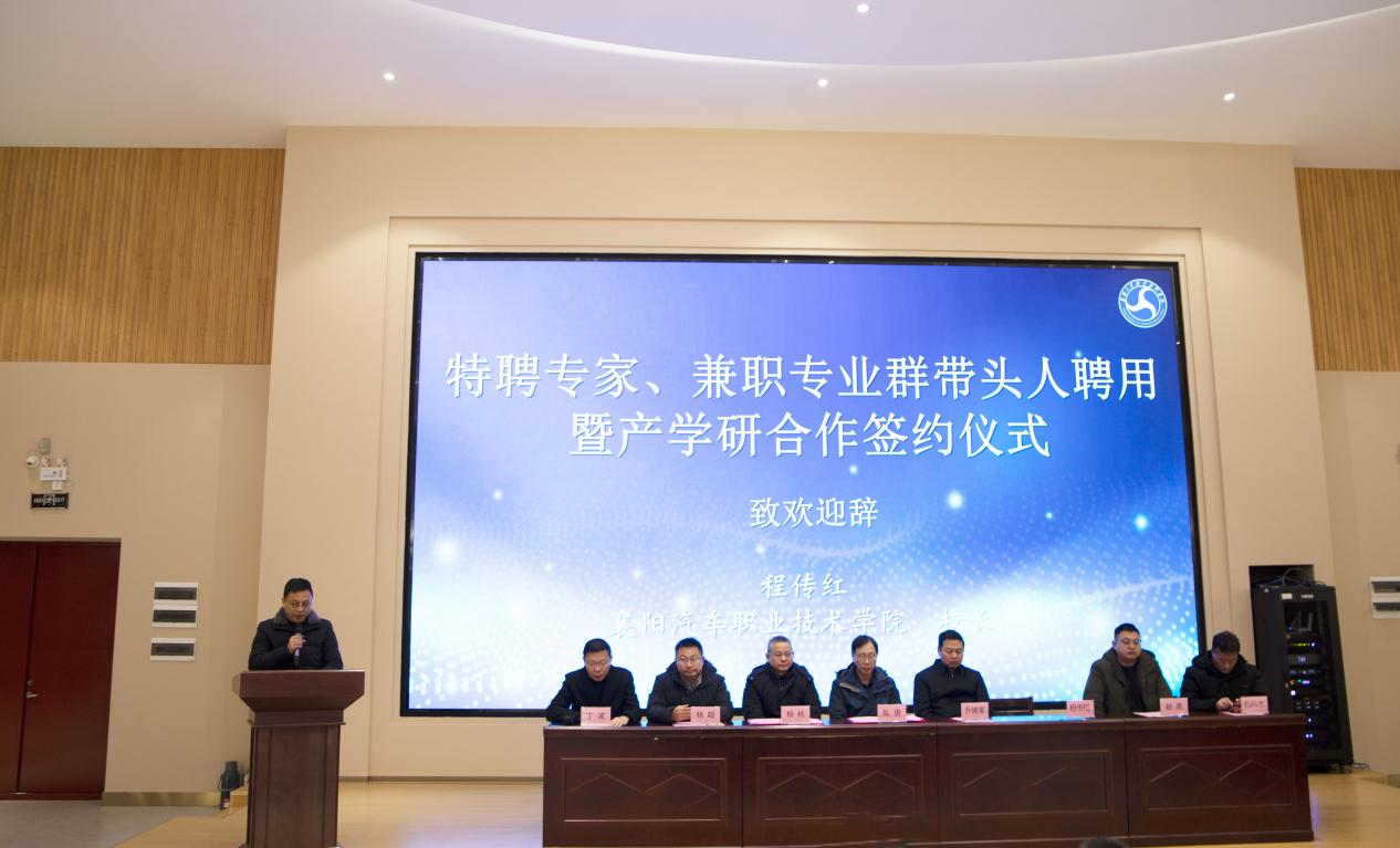 1月8日上午,我校特聘专家、兼职专业群带头人聘任暨产学研合作签约仪式在6号楼思政研修基地举行。广西大学俄罗斯工程院外籍院士陈勇、襄阳市科学技术局副局长乔拥军、襄阳市科学技术协会副主席杨柱、襄阳市科学技术协会院士中心副主任赵亮、清研新能源汽车工程中心(襄阳)有限公司董事长兼总经理杨超、学校校长程传红、党委副书记丁波、副校长包科杰出席仪式。汽车工程(新能源汽车)学院领导和师生代表参加仪式。仪式由校党委副书记丁波主持。