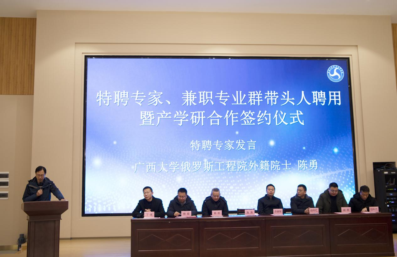 会上,丁波介绍了受聘专家和兼职专业群带头人基本情况和学术成就。程传红代表学校致辞,并发出诚挚的邀请,聘请广西大学俄罗斯工程院外籍院士陈勇为我校的特聘专家,聘请清研新能源汽车工程中心(襄阳)有限公司董事长兼总经理杨超为我校兼职专业群带头人。
