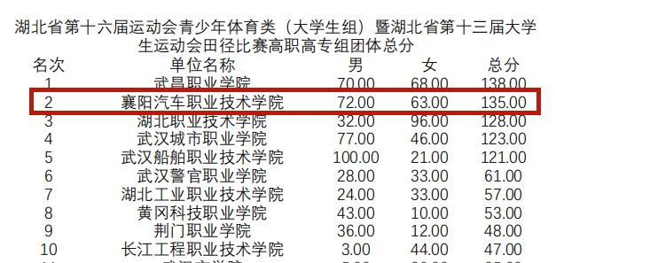 7月12日至14日,湖北省第十六届运动会青少年类(大学生组)暨湖北省第十三届大学生运动会田径比赛在武汉理工大学南湖校区举行,经过为期三天的激烈角逐与竞争,我校代表队斩获了4金2银5铜、3个第四名、3个第五名、1个第八名的好成绩,以团体总分135分的好成绩名列全省高职高专组第2名。另有2人在3个项目中达到国家二级运动员水平。