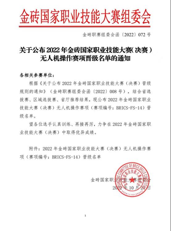 近日,由教育部、人社部、金砖国家工商理事会联合举办的“2022年金砖国家职业技能大赛赛区选拔赛——无人机操作赛项”圆满结束。我校无人机专业参赛学生任步尧获得10省联赛第一名的好成绩,顺利晋级11月的厦门决赛。
