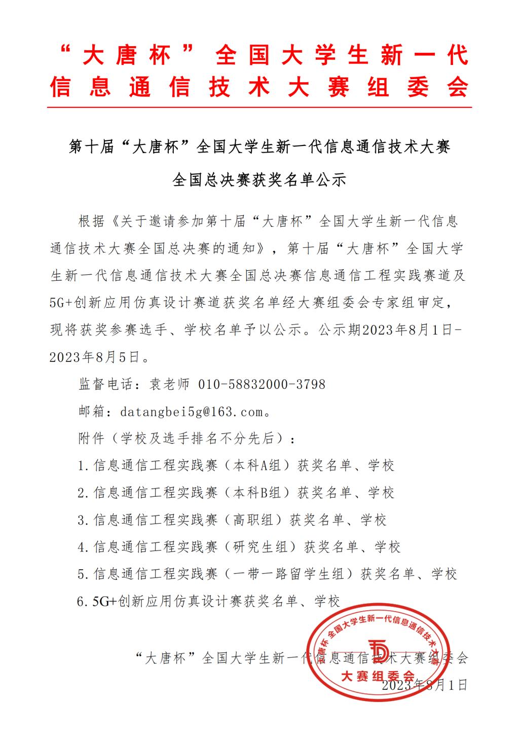 “大唐杯”全国大学生新一代信息通信技术大赛是由工业和信息化部人才交流中心、中国通信企业协会主办,中信科移动通信技术股份有限公司、北京市教委北京高校电子信息类专业群共同组织承办、北方工业大学、北京邮电大学等广大高校协办的全国性创新实践型A类竞赛。同时也是中国高等教育学会高校竞赛评估与管理体系研究工作组发布的教育部认可的56项高含金量大学生学科竞赛之一。