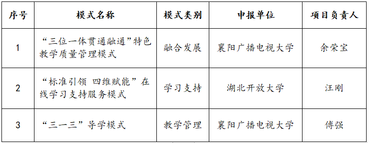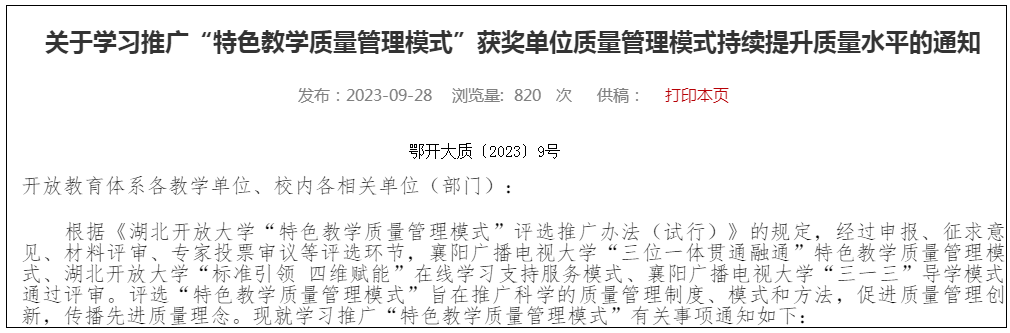 2023年9月28日,湖北开放大学发布关于学习推广“特色教学质量管理模式”的通知,我校申报的“‘三位一体贯通融通’特色教学质量管理模式”、和“‘三一三’导学模式”通过评审,被评选为全省开大体系特色教学质量管理模式。