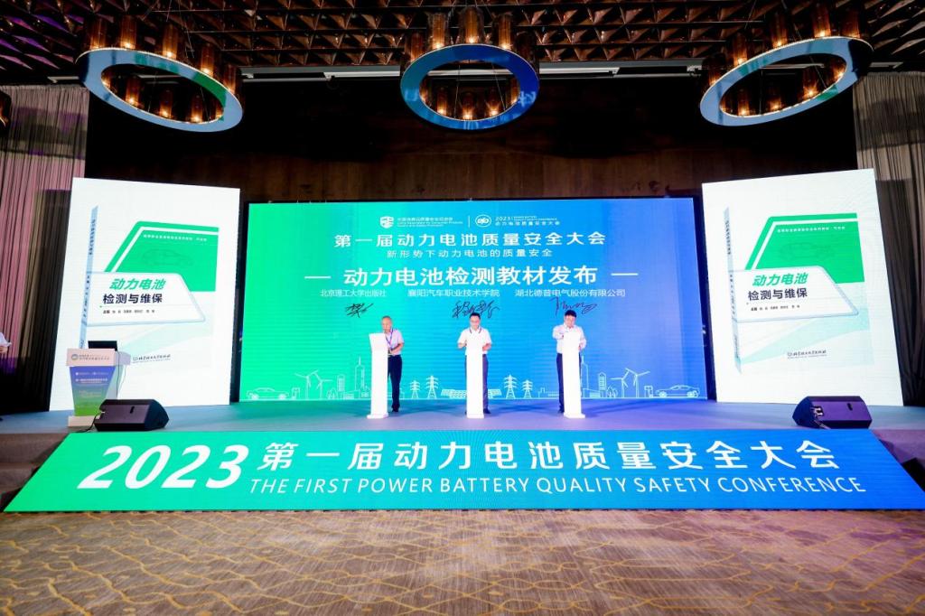 大会上,主办方简单介绍了教材的编写背景和内容,邀请襄阳汽车职业技术学院校长程传红、湖北德普电气股份有限公司董事长陈畅、北京理工大学出版社总编辑樊红亮共同发布了由襄汽与德普合作编写的《动力电池检测与维保》教材。