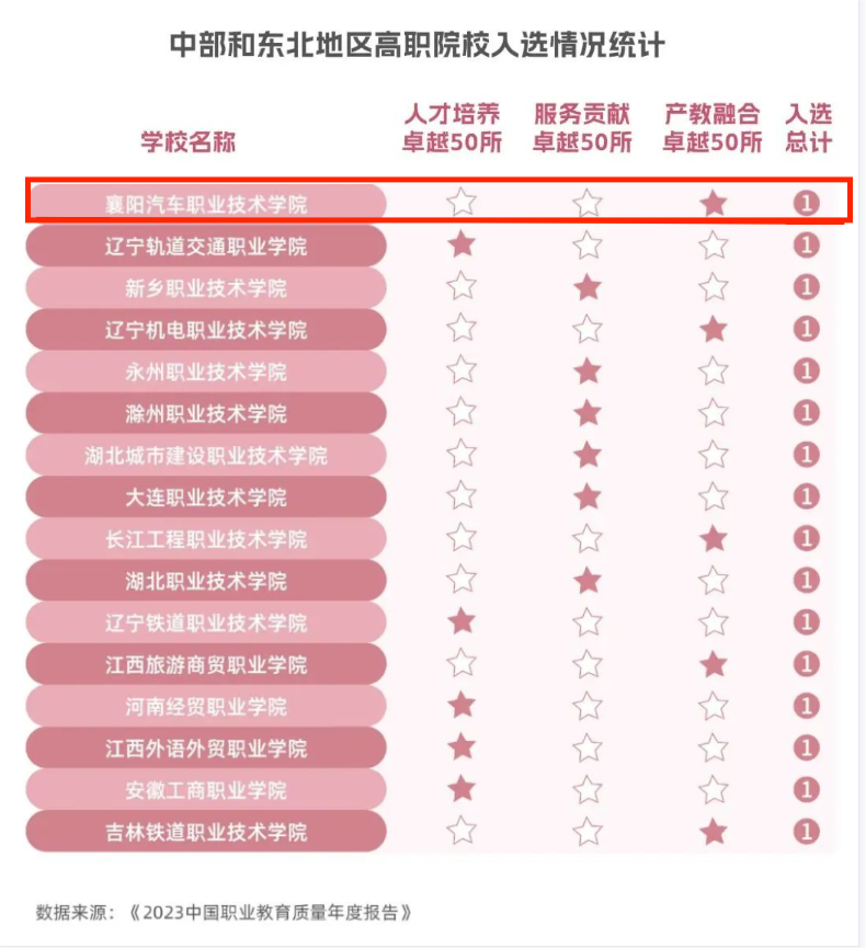 近日,由中国教育科学研究院牵头完成的《2023中国职业教育质量年度报告》正式发布。学校以优异成绩入选中部和东北地区“产教融合卓越50所“榜单,湖北省仅有9所高职院校入围此榜单。