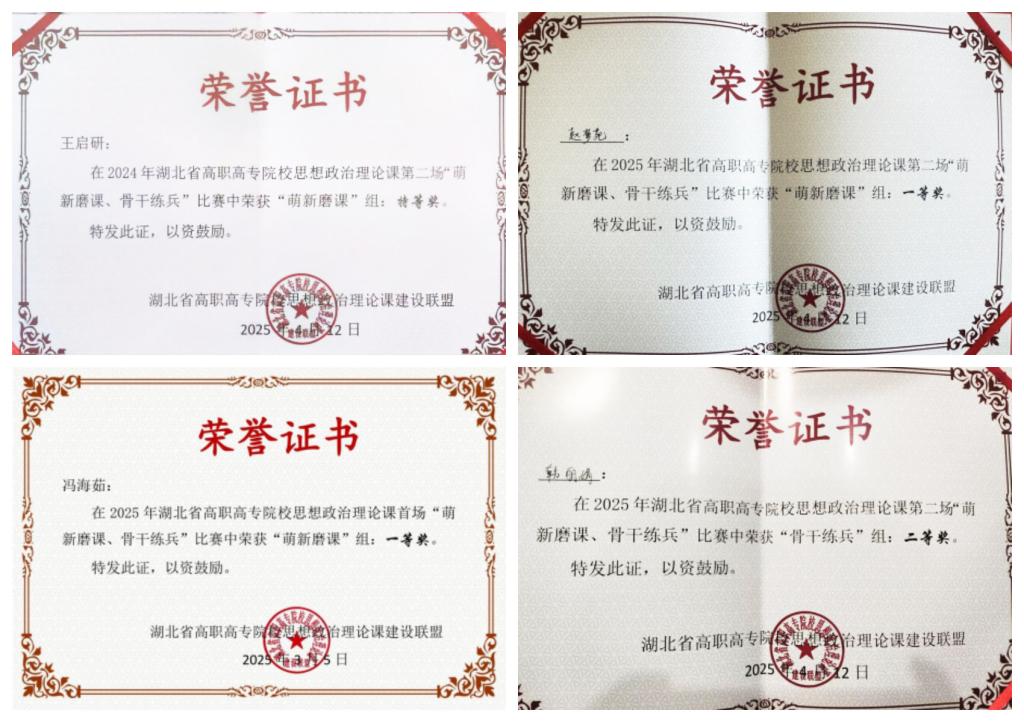 近日,湖北省高职高专院校思想政治理论课建设联盟分别印发《关于2024年湖北省高职高专院校思想政治理论课首场“萌新磨课、骨干练兵”比赛获奖结果的通报》《关于2025年湖北省高职高专院校思想政治理论课首场“萌新磨课、骨干练兵”比赛获奖结果的通报》,我校马克思主义学院教师王启妍老师荣获2024年第二场《毛泽东思想和中国特色社会理论体系概论》课程“萌新磨课”组特等奖,冯海茹荣获2025年首场《习近平新时代中国特色社会主义思想概论》课程“萌新磨课”组一等奖,赵梦苑荣获2025年第二场《思想道德与法治》课程“萌新磨课”组一等奖,韩丽娟荣获2025年第二场《思想道德与法治》课程“骨干练兵”组二等奖。