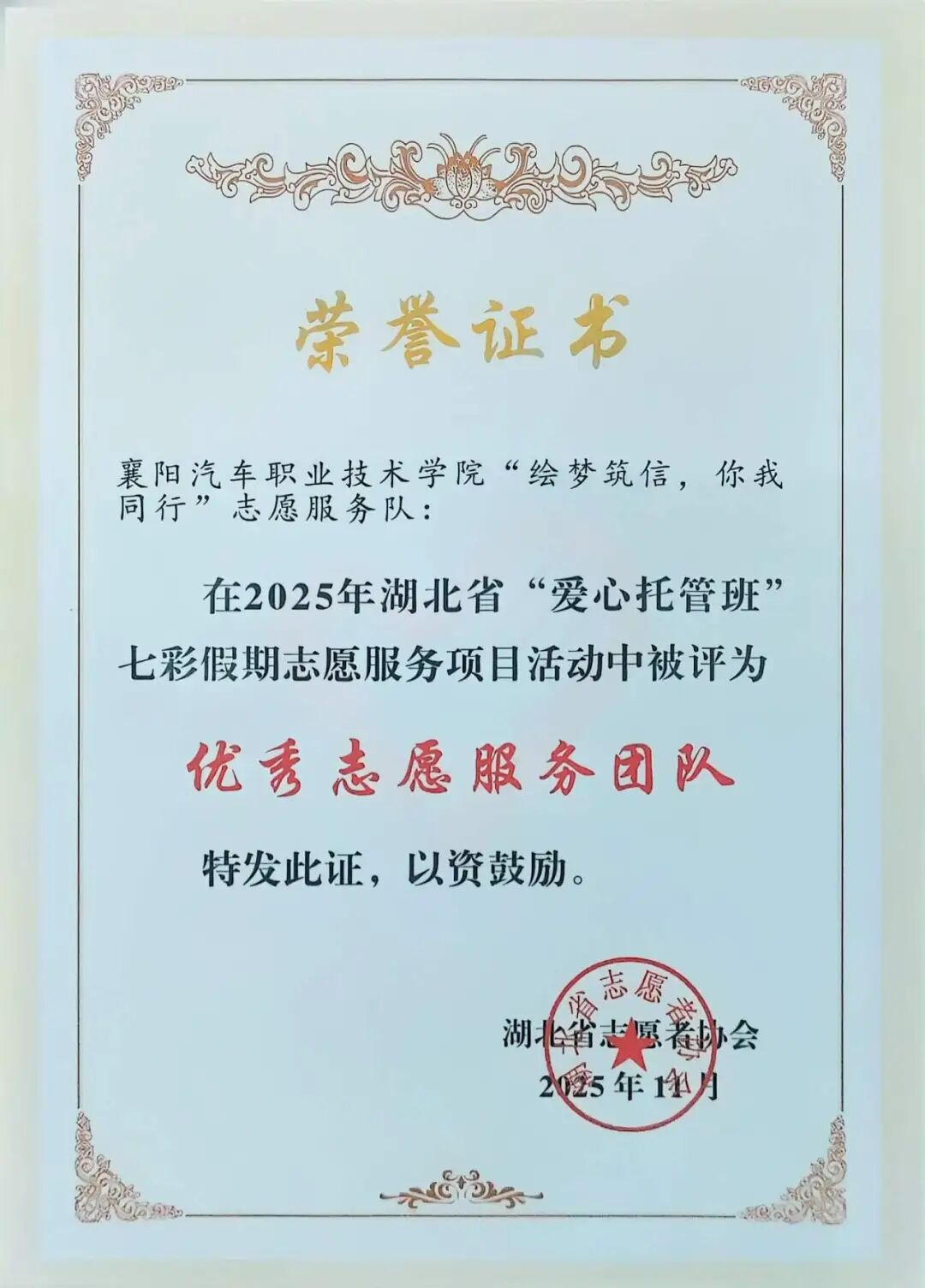 近日,湖北省2025年“爱心托管班”七彩假期志愿服务项目优秀团队评审结果正式揭晓。襄阳汽车职业技术学院人工智能学院“绘梦筑信,你我同行”志愿服务队凭借扎实的服务成效、创新的活动模式和深厚的责任担当,从全省千余支高校志愿服务团队中脱颖而出,成功获评省级“优秀志愿服务团队”。
