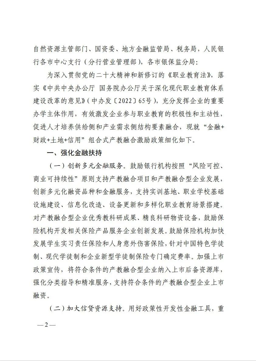 为贯彻落实《关于深化现代职业教育体系建设改革的意见》,2023年1月山东省印发通知,结合职业教育改革发展实际,细化“金融+财政+土地+信用”组合式产教融合激励政策,有效激发企业参与职业教育的积极性和主动性,充分发挥企业的重要办学主体作用。