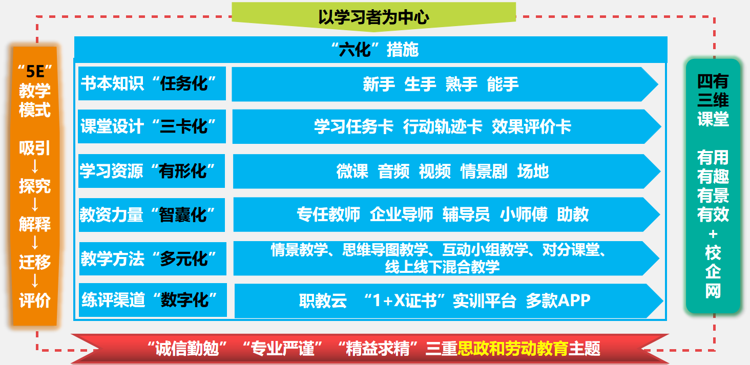 基于OBE教学理念、任务驱动法、行动导向教学理论,本课程以“学习者为中心”,将诚信勤勉、专业严谨、精益求精三重思政和劳动教育主题贯穿其中,配合“1+X证书”,深入推进“岗课赛证”融合。围绕5E教学模式,通过“六化”措施,在尊重、自由、平等的课堂环境中,将“校、企、网”三个维度联合起来,打造有用、有趣、有景、有效的“六化四有三维”课堂。