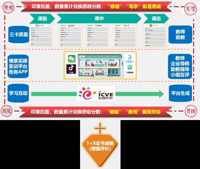 课程构建了多维度考核评价体系,结合整体教学策略和教学设计,围绕思政教育、劳动教育,对学生知识掌握度、过程参与度进行全面考核,并结合“1+X证书”考试标准,进行专业技能考核,将任课教师、企业导师、学生助教三方评价结合起来。设计4枚印章“修德、笃学、砺能、善用”,针对效果评价卡完成情况进行扣盖,“修德”“笃学”彰显思政,“砺能”“善用”展现劳动。同时,将证书成绩作为课程的增值评价纳入课证融通考核中。